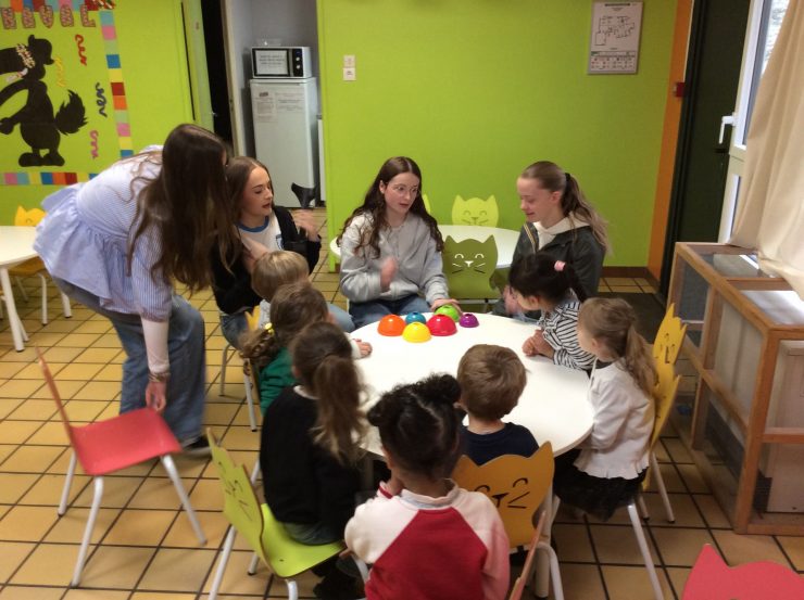 Dans le cadre de la semaine des langues, les élèves de 3ème de l’option Espagnol + sont venus faire un petit cours d’espagnol aux classes de TPS/PS et MS avec leur professeur Mme Alonso. Au programme, les parties du corps , les couleurs, les animaux … Mme Alonso est également venue raconter l’histoire de Jack et le haricot magique en espagnol aux enfants de petite section.